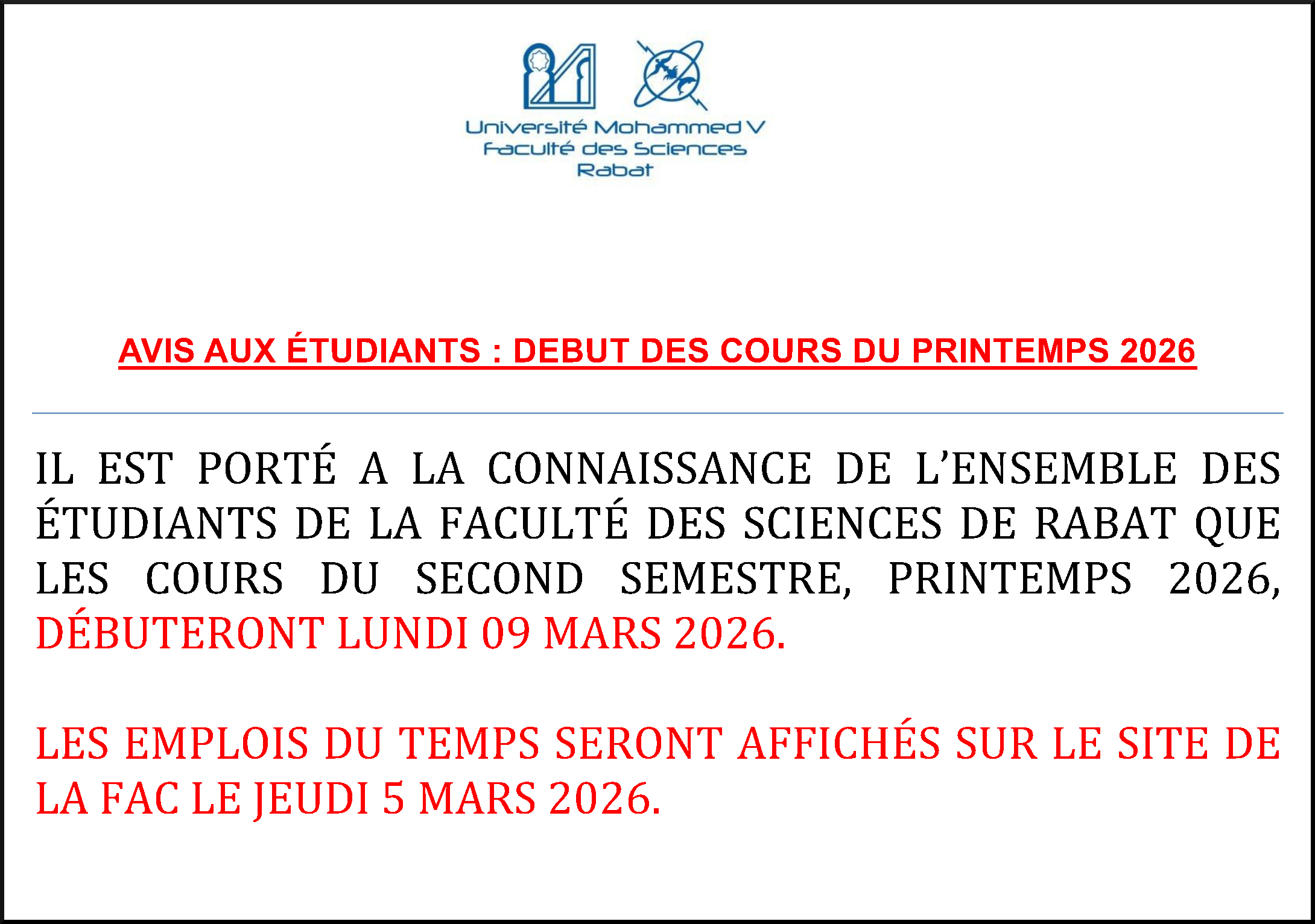 IL EST PORTÉ A LA CONNAISSANCE DE L’ENSEMBLE DES ÉTUDIANTS DE LA FACULTÉ DES SCIENCES DE RABAT QUE LES COURS DU SECOND SEMESTRE, PRINTEMPS 2026....